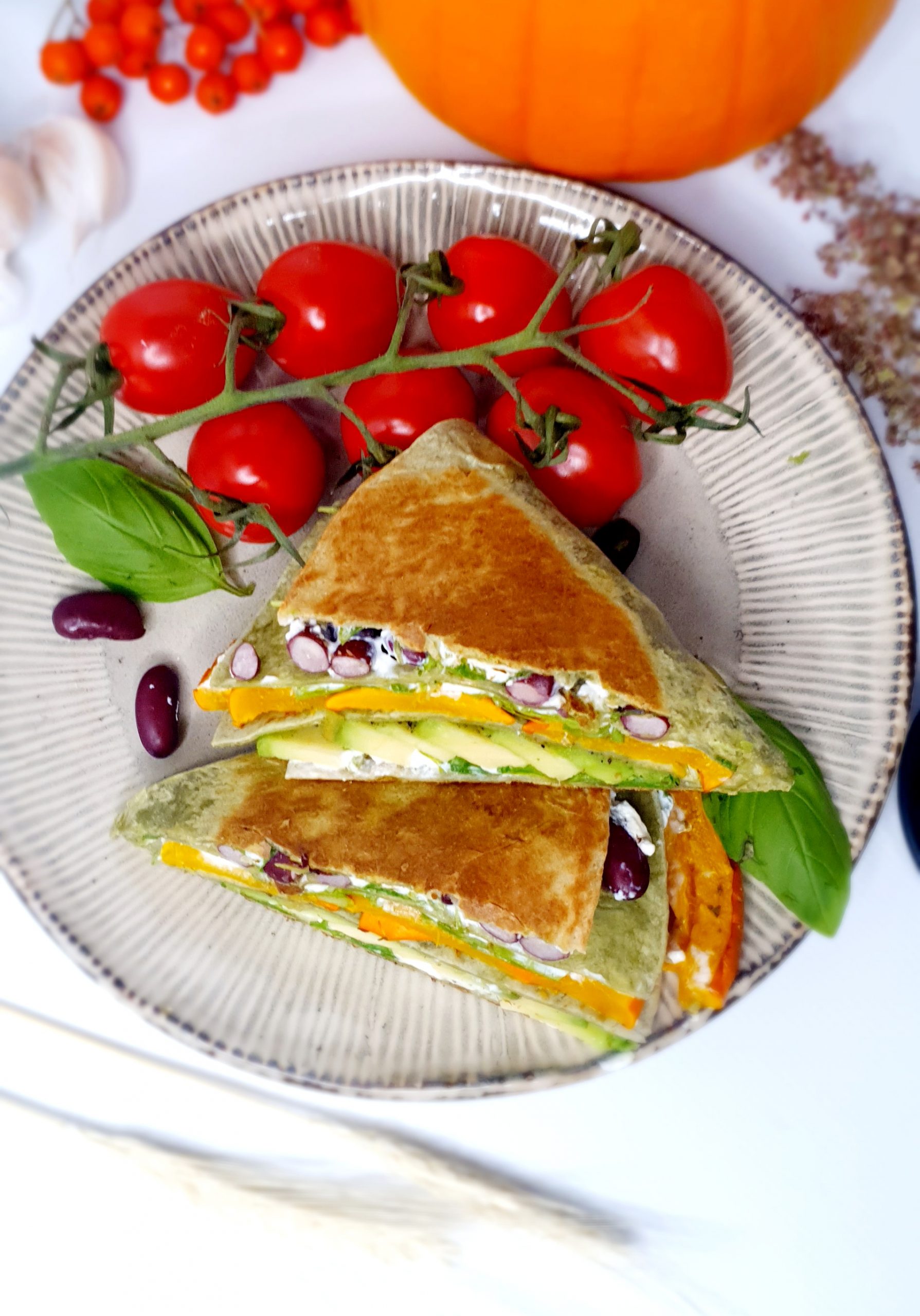 Chrupiąca tortilla z dynią, fasolą i awokado