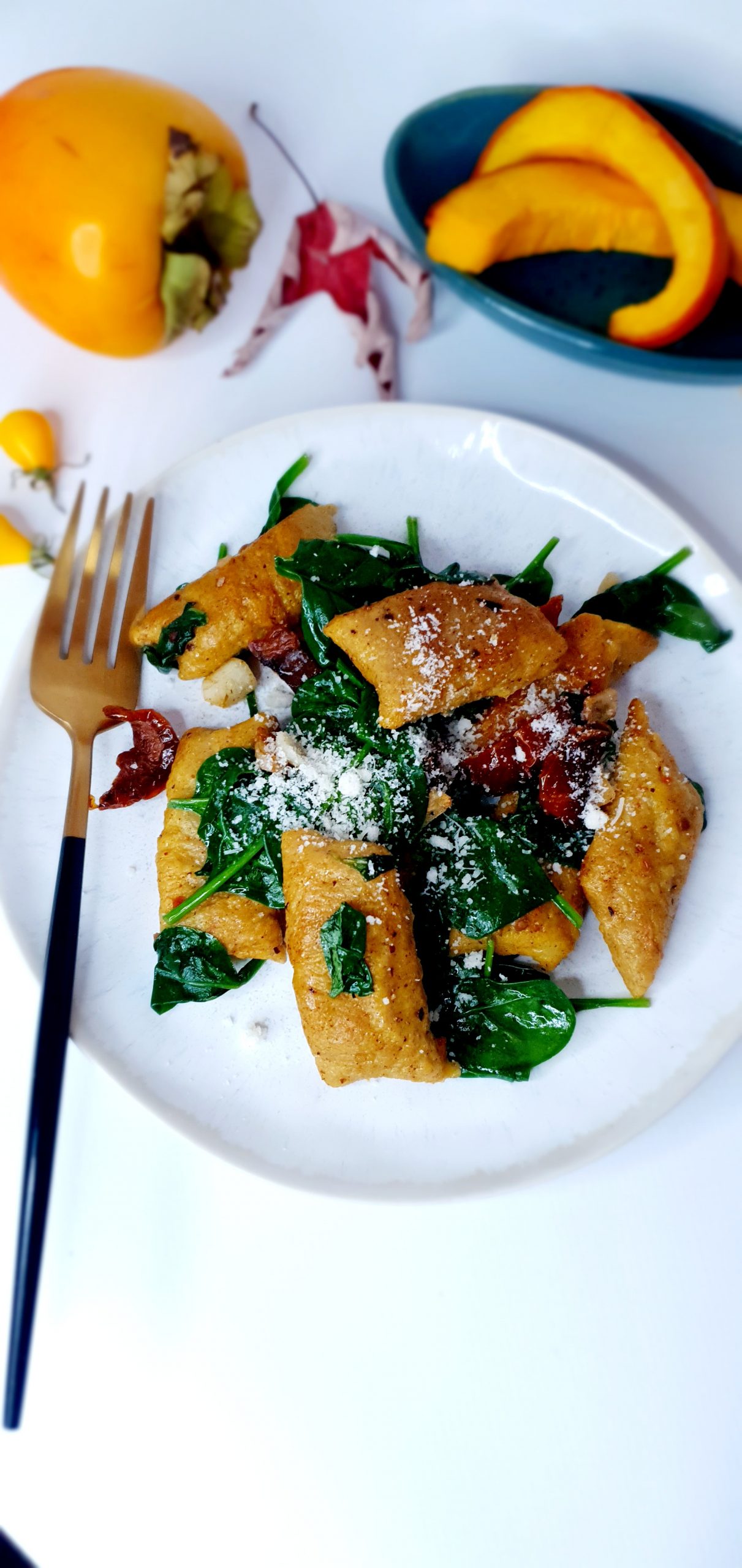 Kopytka dyniowe ze szpinakiem i suszonymi pomidorkami